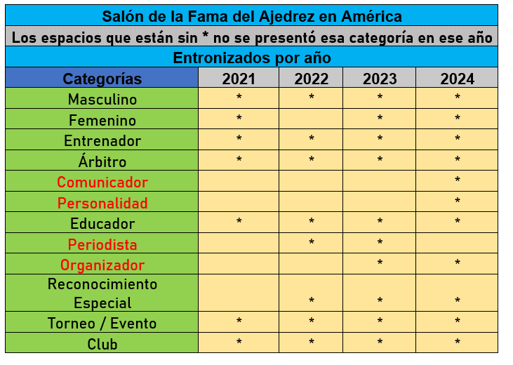 El salón de la Fama del Ajedrez de México tiene las siguientes categorías: I. Ajedrecista masculino, II. Ajedrecista Femenino, III. Entrenador, IV. Árbitro, V. Educador, VI. Comunicador, VII. Personalidad, VIII. Organizador, IX. Evento, X. Club, se tiene una categoría donde el comité no puede elegir, y lo elige el presidente y es la Distinción Especial.